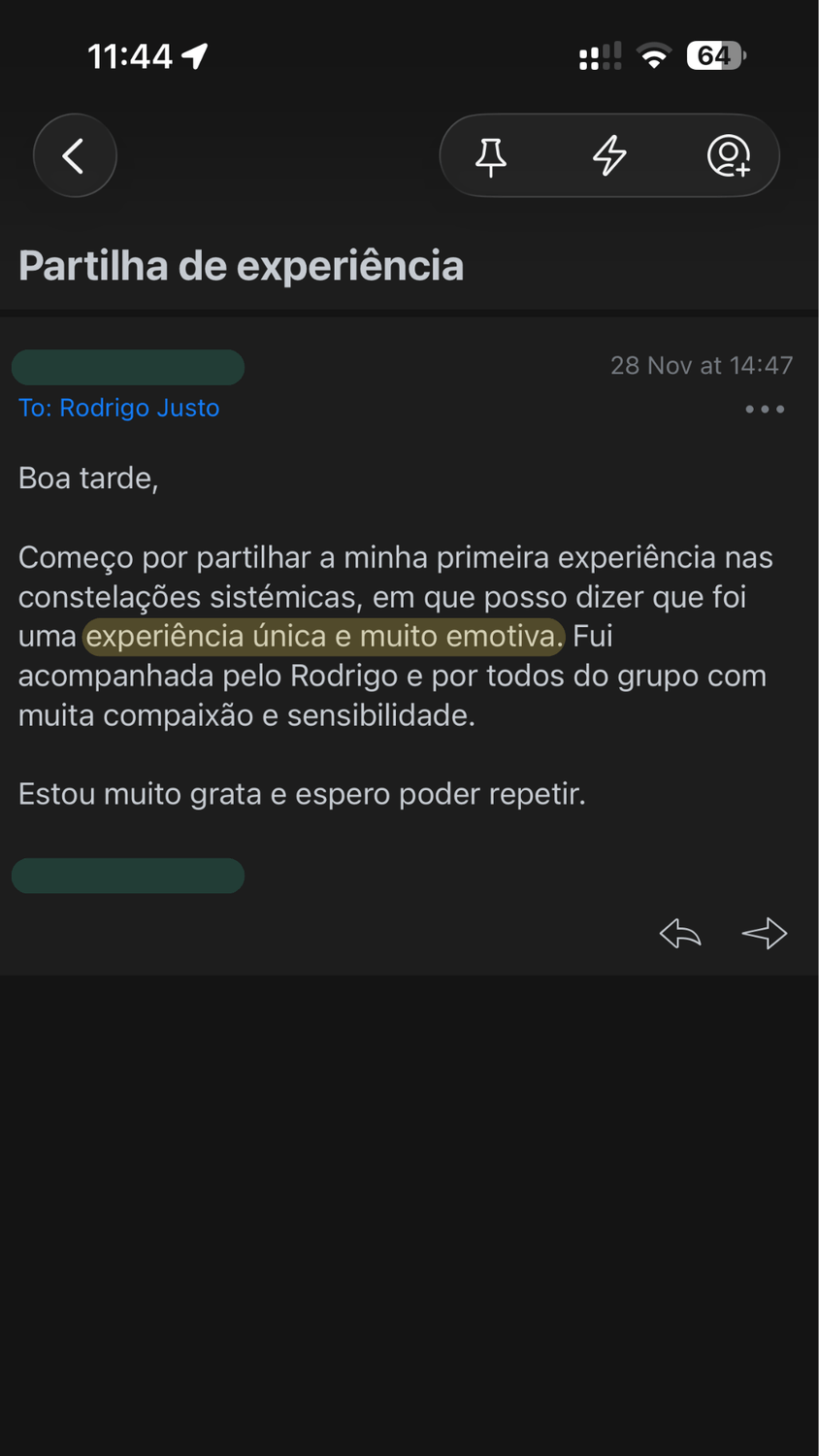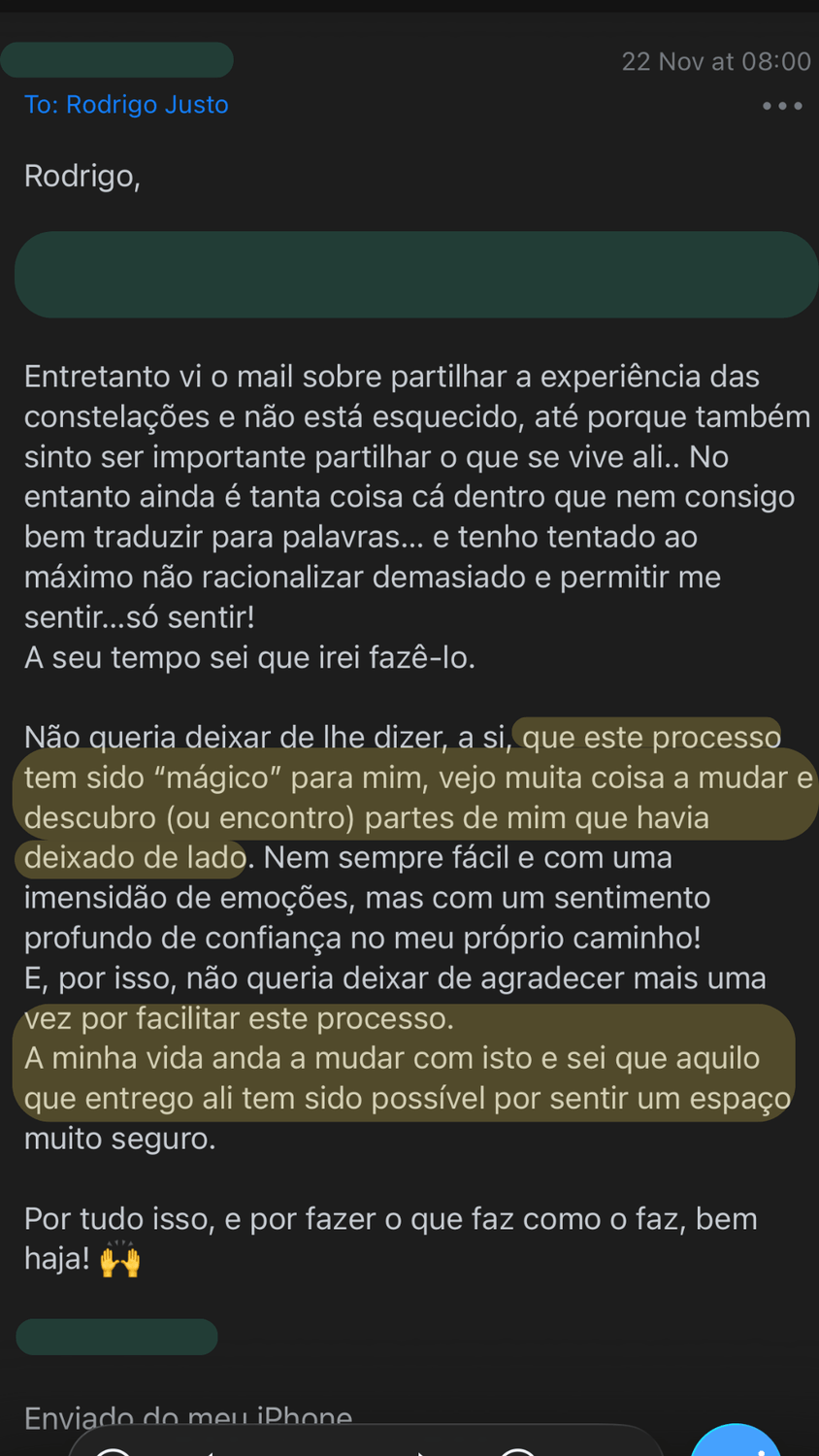 Com o tempo, compreendi que muitas dificuldades não se resolvem apenas ao nível individual, mas estão ligadas aos sistemas onde estamos inseridos. As Constelações Sistémicas trouxeram esse entendimento de forma clara e concreta, e rapidamente se tornaram uma parte central do meu trabalho.